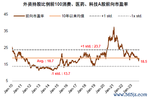 图表:外资持股前100消费、医药、科技指数估值已调整至历史均值附近