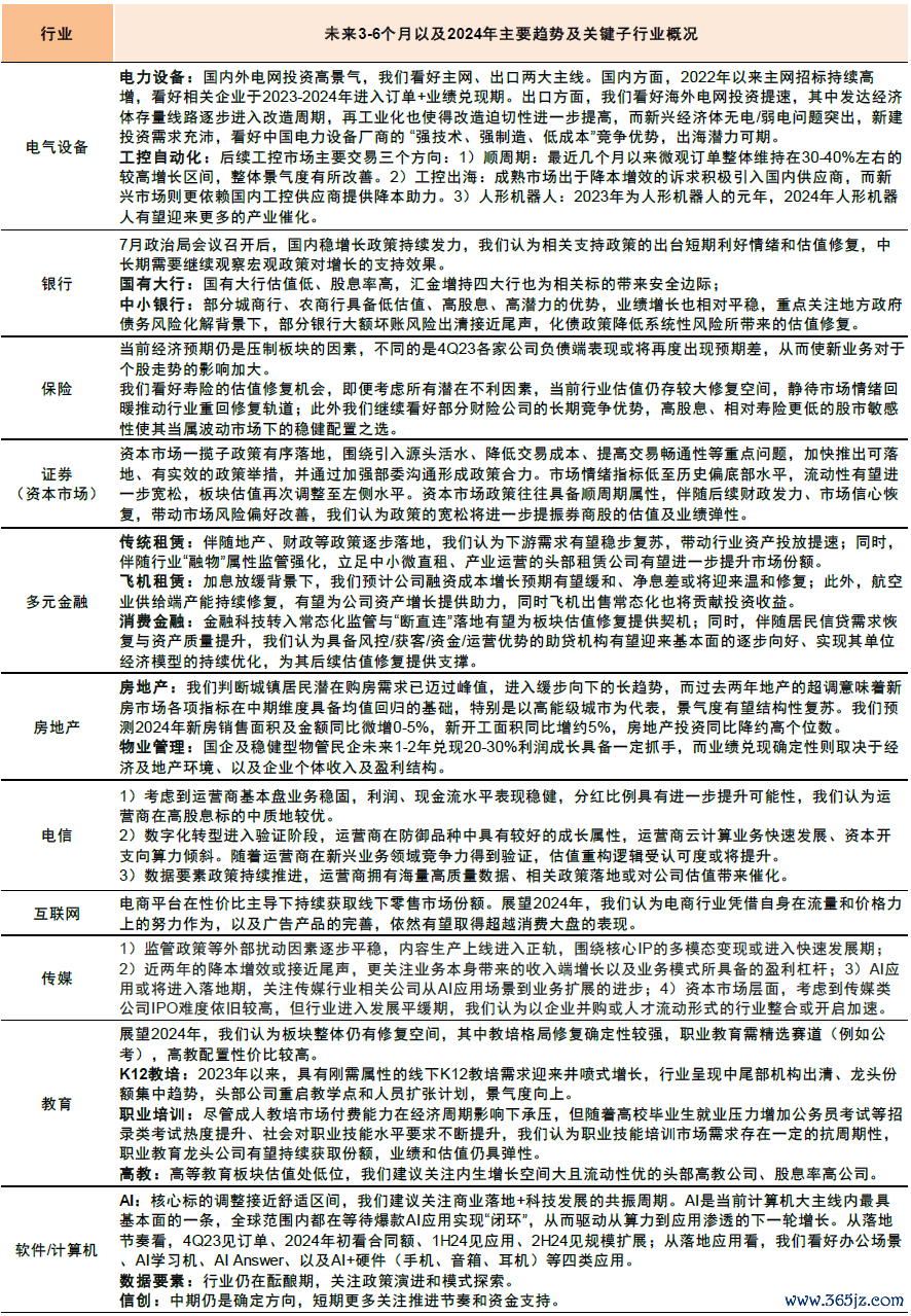 关注6大主题性机会。周期性的波动及结构性的趋势,同时叠加资金面相对宽松,也提供了较多主题性的机会。我们提示未来3-6个月关注如下主题:1)现代化产业体系建设;2)人工智能及数字经济;3)国企改革;4)消费“精细化”;5)“出口链”受益领域;6)超跌优质龙头,等等。