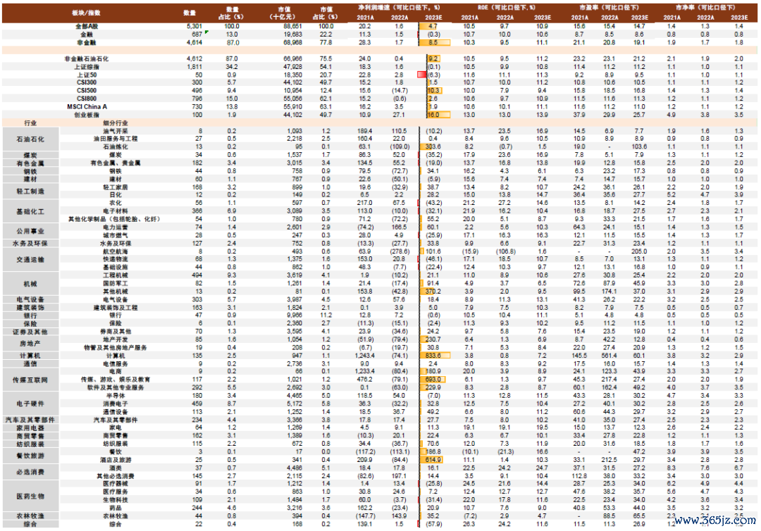 我们预计金融板块2024年盈利同比增长在4.2%左右。2024年银行业在息差收窄和非息收入放缓的背景下,中金银行组预计上市银行营收小幅下降而净利润同比+3.2%。[7]券商板块可能受益活跃资本市场政策落地,保险新业务也有望回暖,综合估算金融板块盈利同比增长可能在4.2%左右,2024年全A盈利同比增长可能在4.7%左右。