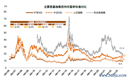 图表:沪深300/中证500/上证指数/创业板指分别位于2006年以来22.2%/22.8%/30.1%/ 10.0%分位
