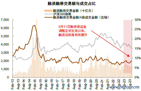 图表:2023年9月以来两融资金交易额占A股成交额比重有所提升