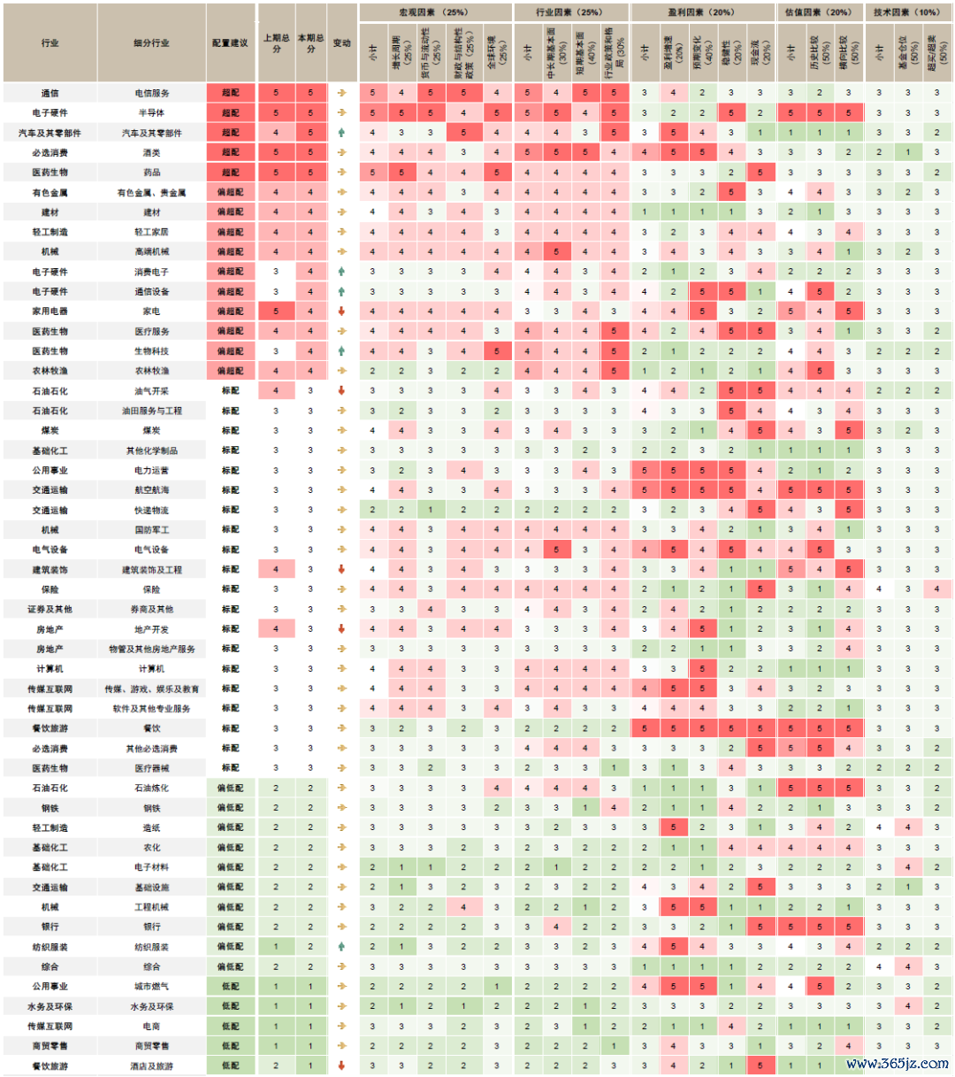 综合对增长及政策的预期、自下而上中金行业分析员的观点,并考虑行业的景气程度及估值等因素,我们更新了行业配置表格。后续仍将根据增长、政策及估值等因素来综合评估及调整配置建议。