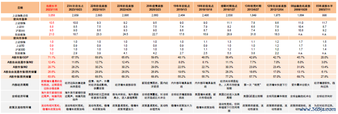 图表:当前A股估值水平与历次市场阶段性底部时期对比