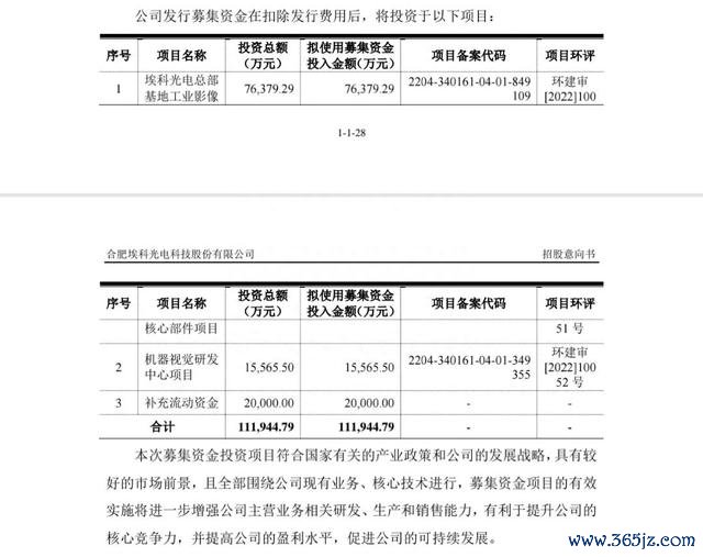 埃科光电招股书中计划本次上市募集11.19亿用于:埃科光电总部基地工业影像核心部件项目、机器视觉研发中心项目、补充流动资金。