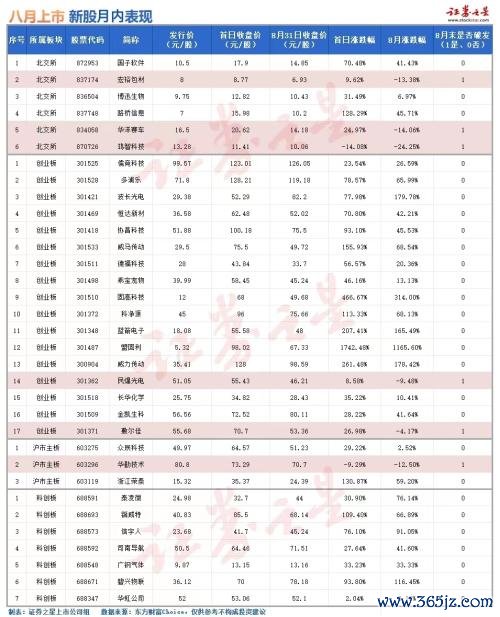 但是拉长时间线看,8月份33只新股,在月末的收盘价多数出现下滑。